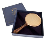 El espejo se encuentra en una elegante caja de terciopelo azul.