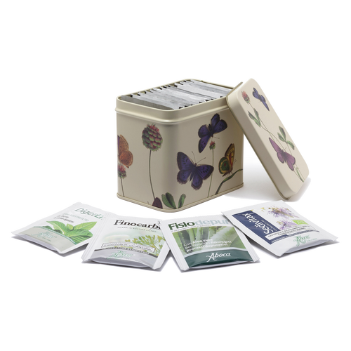 Cofanetto in metallo portatisane decoro Farfalle con 16 tisane